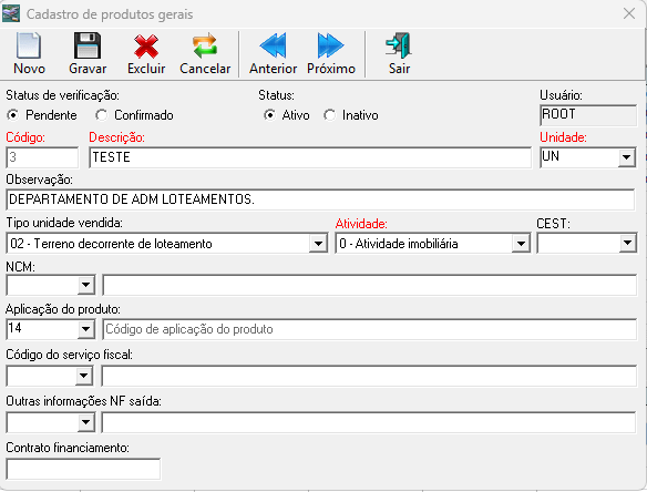 Após informar os dados necessários ao cadastro, clique no botão , para que o novo produto seja gravado. Caso queira cancelar os dados digitados, clique em