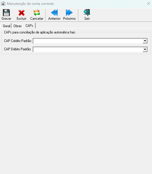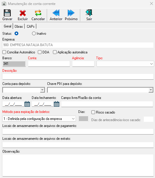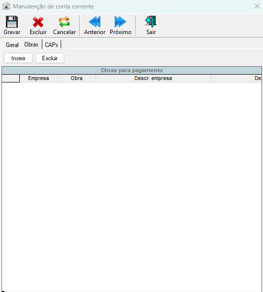 • Obras: exibe a tabela de obras vinculadas às contas bancárias cadastradas no banco e empresa selecionados, se existir.