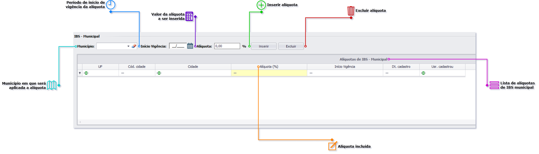 • Grade de alíquotas de IBS – Municipal: Exibe as alíquotas cadastradas, incluindo as colunas: