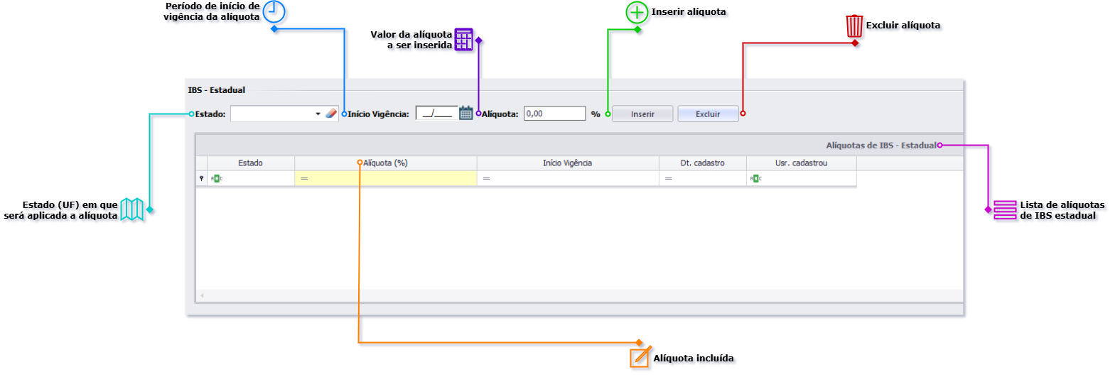 • Grade de alíquotas de IBS – Estadual : Exibe as alíquotas cadastradas, incluindo as colunas:
