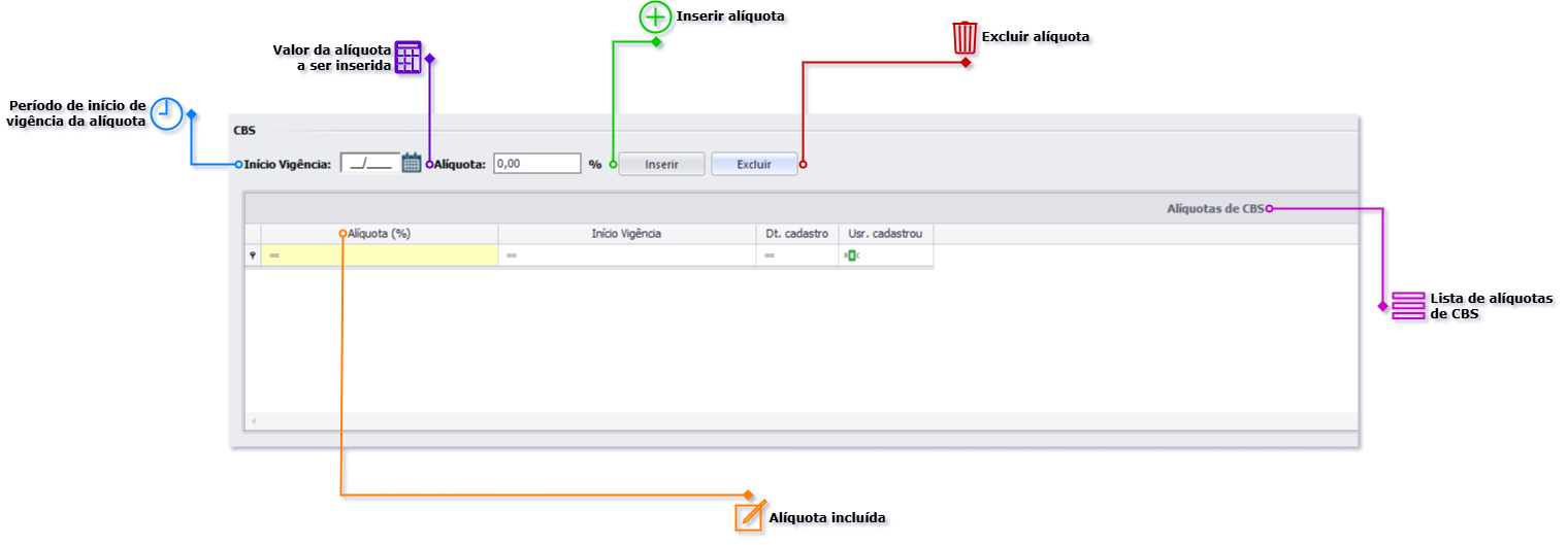 • Grade de alíquotas de CBS: Exibe as alíquotas cadastradas, incluindo as colunas: