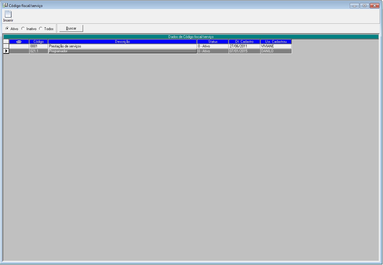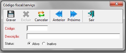 Inserir: Cadastra novo código Fiscal/Serviço.