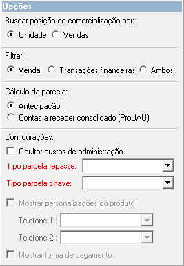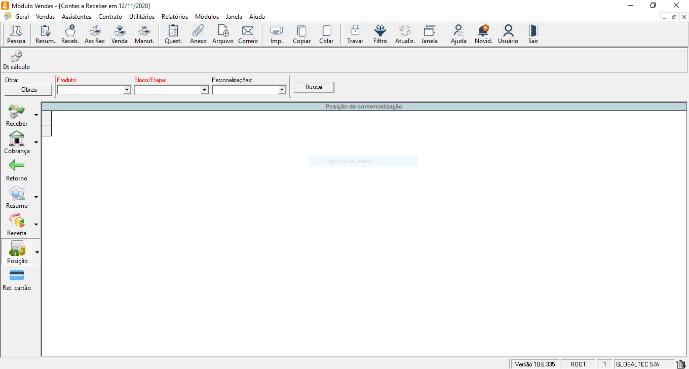 Posição de comercialização tem por objetivo mostrar de forma detalhada a situação das unidades de uma determinada obra. Se a unidade está vendida ou não, qual o cliente e o detalhamento desta personalização, os valores de recebimento e valores a receber. Também é usado para enviar o relatório para o banco das unidades financiadas onde existe o repasse do financiamento.