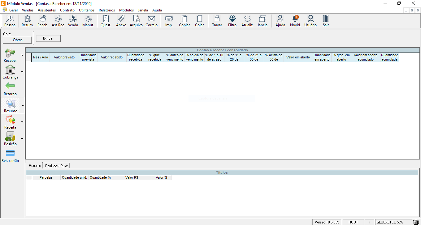 O resumo de carteira mostrará os títulos por mês de vencimento de todas as parcelas de todas as vendas. Será respeitado o filtro por Empresa/Obra.