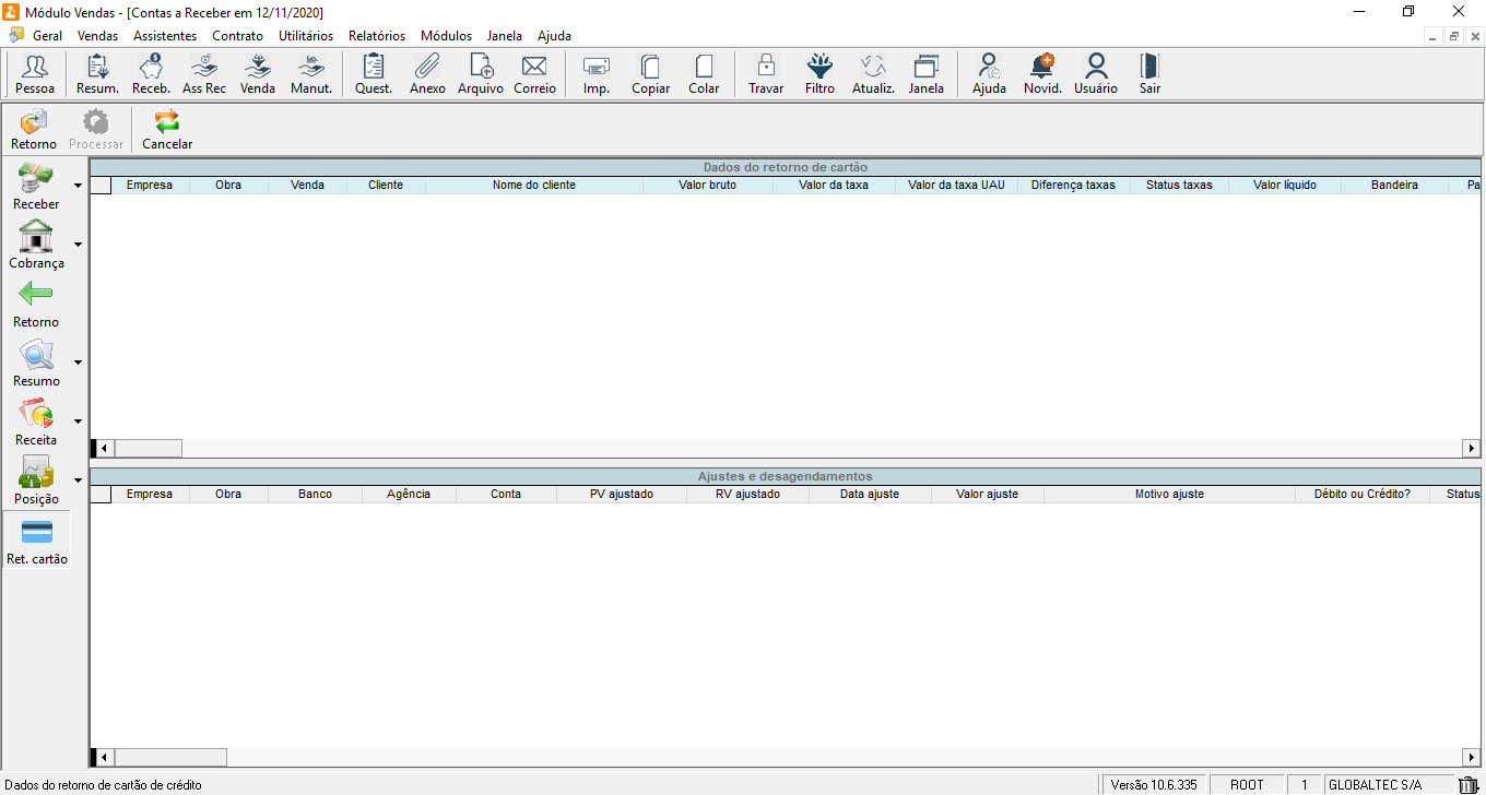 Contas a receber – Visão Resumo/ Receita/ Posição/ Ret. Cartão – Globaltec