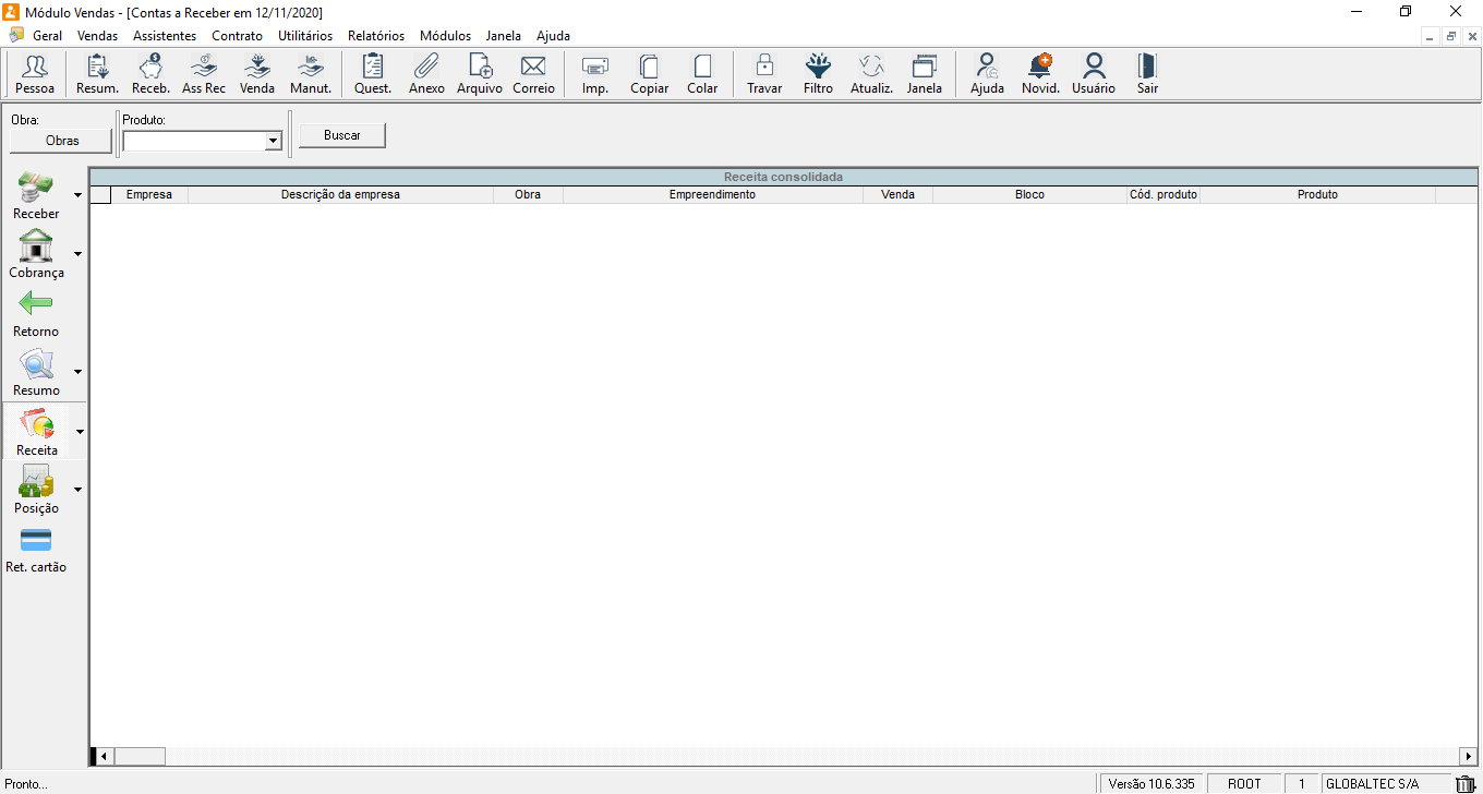 A receita consolidada mostrará os dados da(s) empresa(s)/obra(s) selecionada(s) com informações das contas recebidas e a receber quebrado por item da venda.