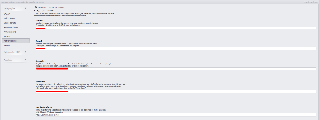 • Com as informações de Domain, Tenant, Access Key e Secret Key em mãos, vá para o UAU XT.