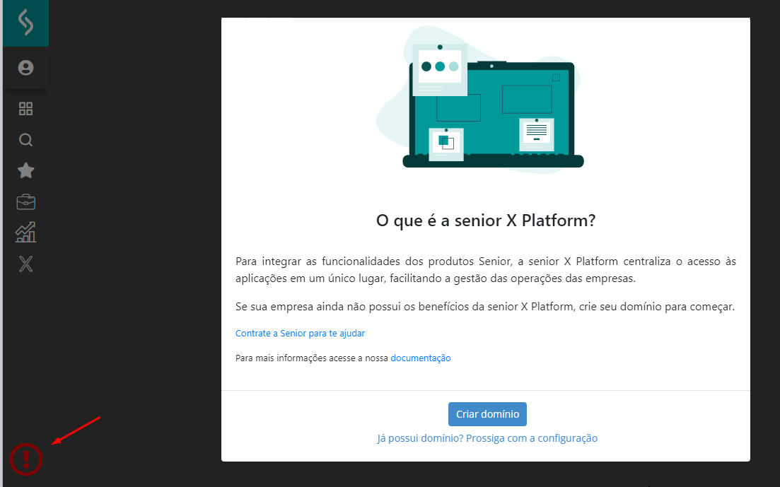 Se você ainda não possui um domínio na plataforma e está iniciando sua jornada no UAU XT, o processo de criação do domínio é o ponto de partida essencial. Siga os passos abaixo para criar seu domínio diretamente do menu, acessível pelo ícone de exclamação em vermelho: