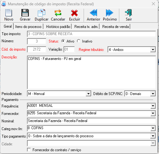 Cód. imposto: Código do imposto da SRF.