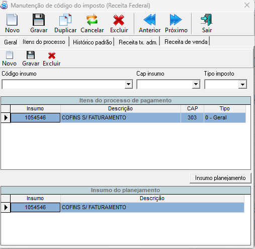 Insumo: Insumo a ser relacionado com o código de imposto.